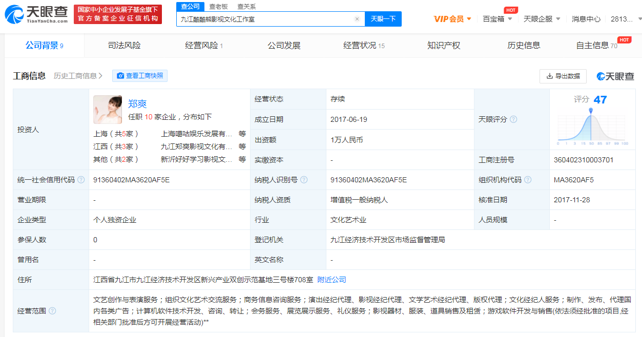 郑爽两家工作室经营异常