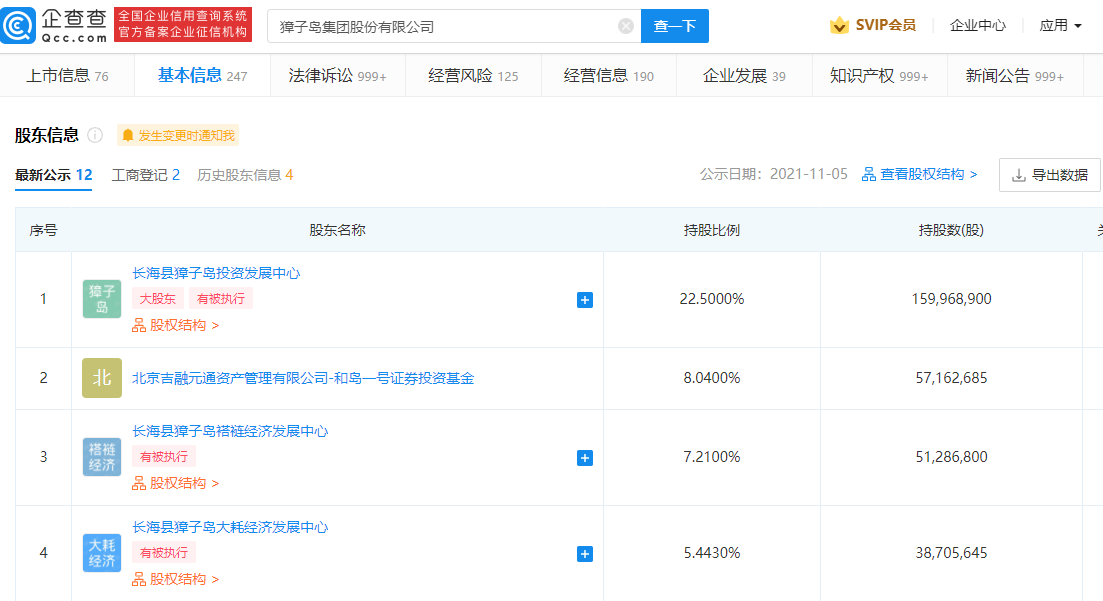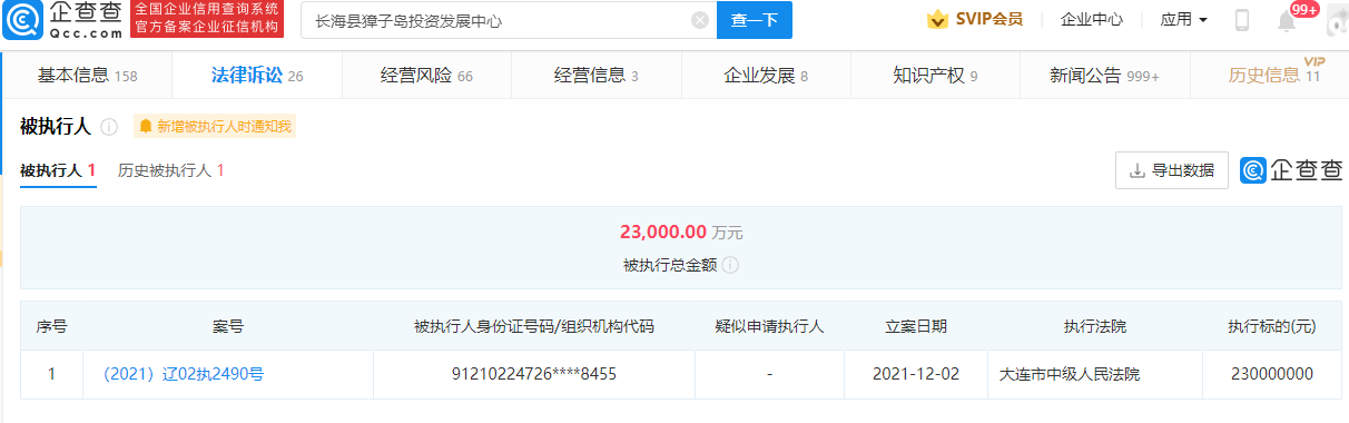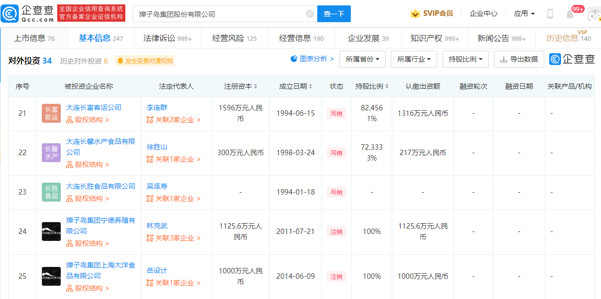 企查查APP显示,獐子岛目前共对外投资34家企业,其中15家企业已注吊销。獐子岛大股东长海县獐子岛投资发展中心,2021年12月新增被执行人信息,执行标的2.3亿元。
