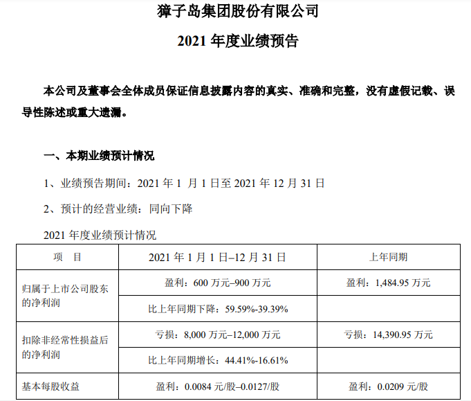 獐子岛(002069)1月20日晚发布2021年度业绩预告,公司预计2021年实现净利润600万元–900万元,比上年同期下降59.59%-39.39%,上年同期盈利1484.95 万元;实现扣非净利润亏损8000万元–1.2亿元,比上年同期增长44.41%-16.61%,上年同期亏损1.44亿元。
