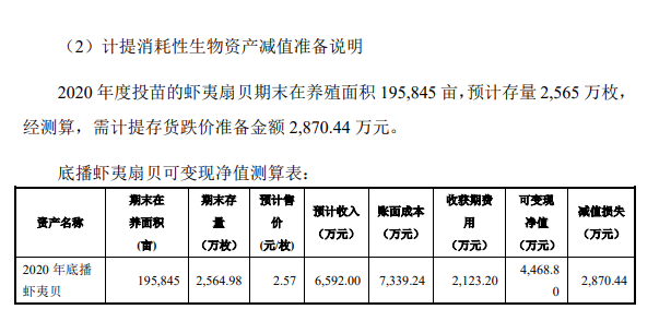 此外獐子岛同步公告表示,预计对2020年投苗的195845亩海域成本为7339.24万元的底播虾夷扇贝存货计提减值准备2870.44万元。