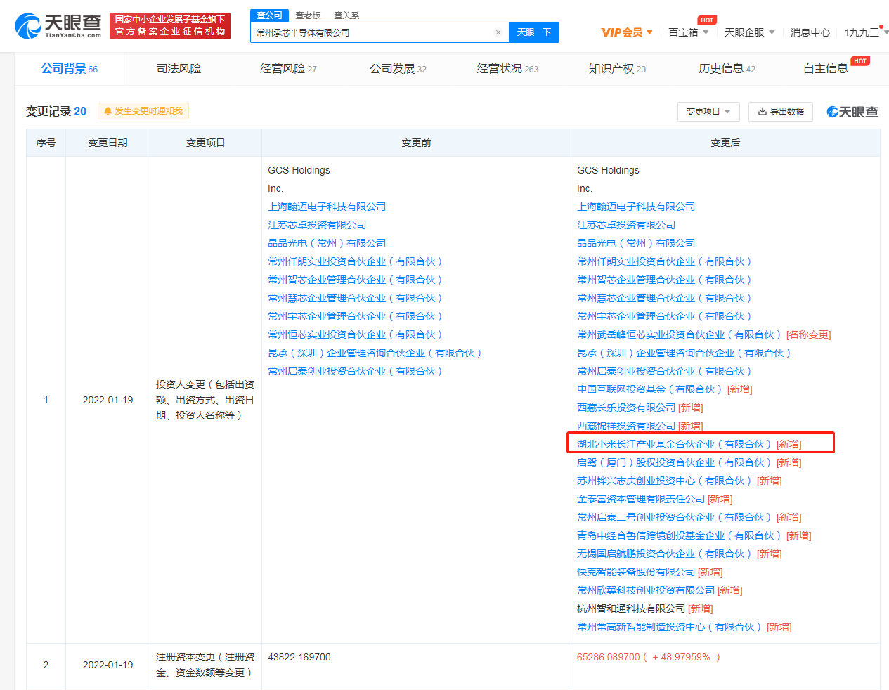 鞭牛士 1月21日消息,天眼查App显示,近日,常州承芯半导体有限公司发生工商变更,新增股东湖北小米长江产业基金合伙企业(有限合伙)等,同时企业注册资本增至约6.53亿人民币。