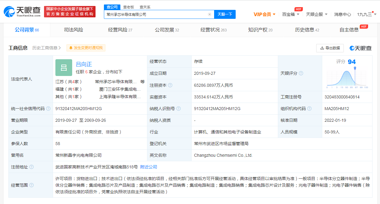 常州承芯半导体有限公司成立于2019年9月,法定代表人为吕向正,经营范围包括半导体分立器件制造、销售;集成电路芯片及产品制造、销售;集成电路芯片设计及服务;光电子器件制造、销售等。
