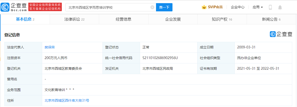 企查查APP显示,北京市西城区学而思培训学校成立于2009年,社会组织类型为民办非企业单位,证书有效期为2021-05-31至2022-05-31。