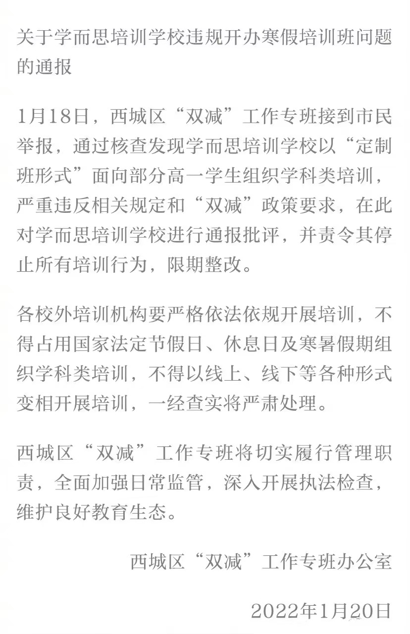 鞭牛士 1月21日消息,西城区“双减”工作专班办公室1月20日发布关于学而思培训学校违规开办寒假培训班问题的通报。通报称,1月18日,西城区“双减”工作专班接到市民举报,通过核查发现学而思培训学校以“定制班形式”面向部分高一学生组织学科类培训,严重违反相关规定和“双减”政策要求,在此对学而思培训学校进行通报批评,并责令其停止所有培训行为,限期整改。
