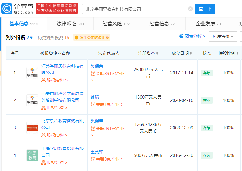 企查查显示,北京学而思教育科技有限公司共对外投资79家企业。