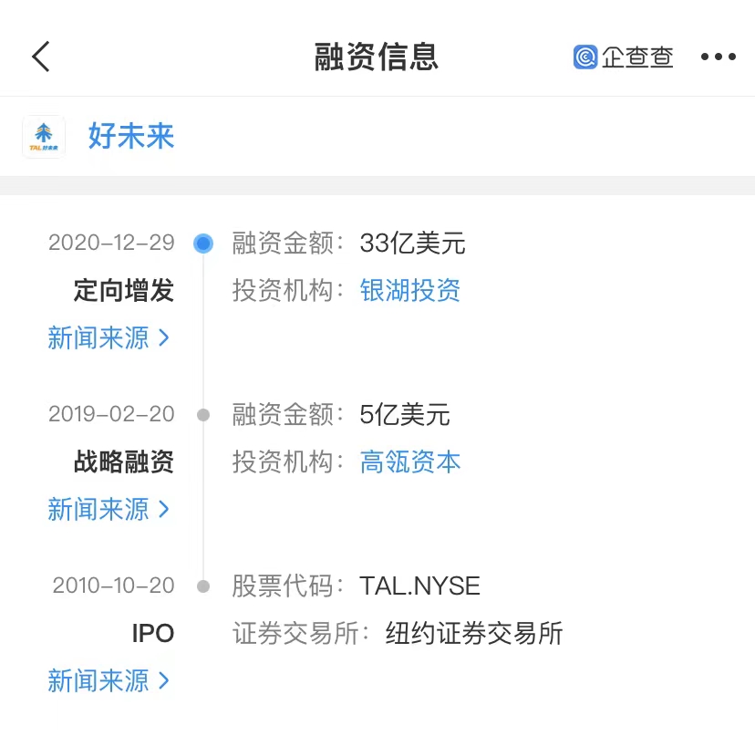 好未来(NYSE:TAL)是一家以智慧教育和开放平台为主体,在全球范围内服务公办教育,助力民办教育,探索未来教育新模式的科技教育公司。企查查APP显示,2010年10月20日,学而思教育在纽约证券交易所正式挂牌交易,成为国内首家在美国上市的中小幼课外教育培训机构,后更名为好未来集团。