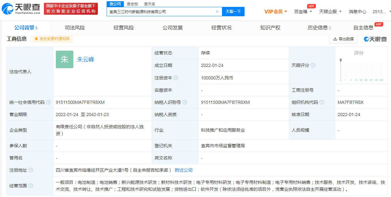 鞭牛士 1月25日消息,天眼查App显示,近日,宜宾三江时代新能源科技有限公司成立,注册资本10亿人民币,法定代表人为朱云峰,经营范围含电池制造、销售;新兴能源、新材料、技术研发;电子专用材料研发、制造、销售等。