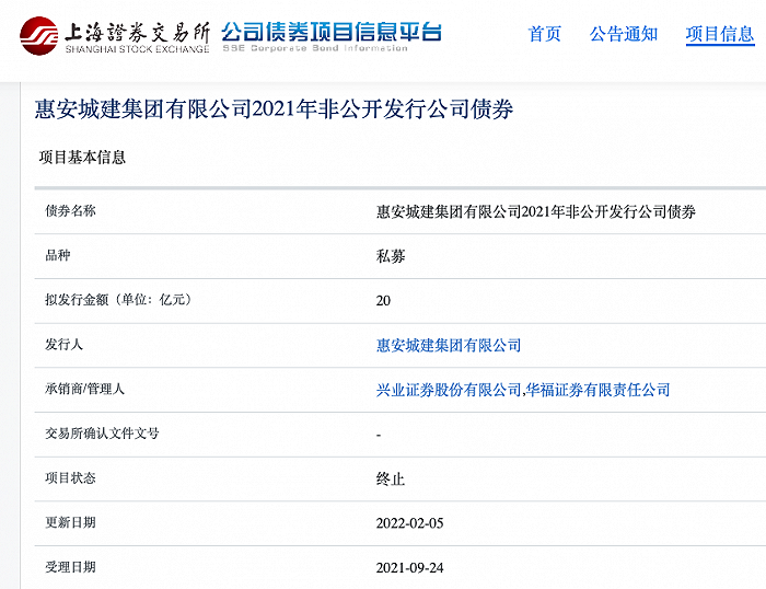 惠安城建20亿元私募项目状态更新为“终止”
