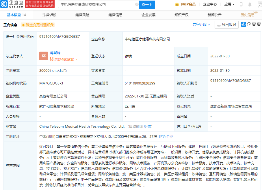 中国电信投资成立医疗健康科技公司,注册资本2亿元