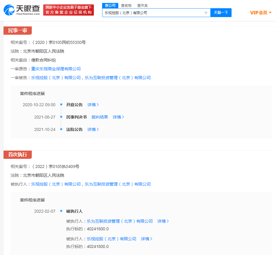 鞭牛士 2月9日消息,近日,乐视控股(北京)有限公司、乐为互联投资管理(北京)有限公司新增被执行人信息,执行标的4024万余元,执行法院为北京市朝阳区人民法院,关联案件为借款合同纠纷。