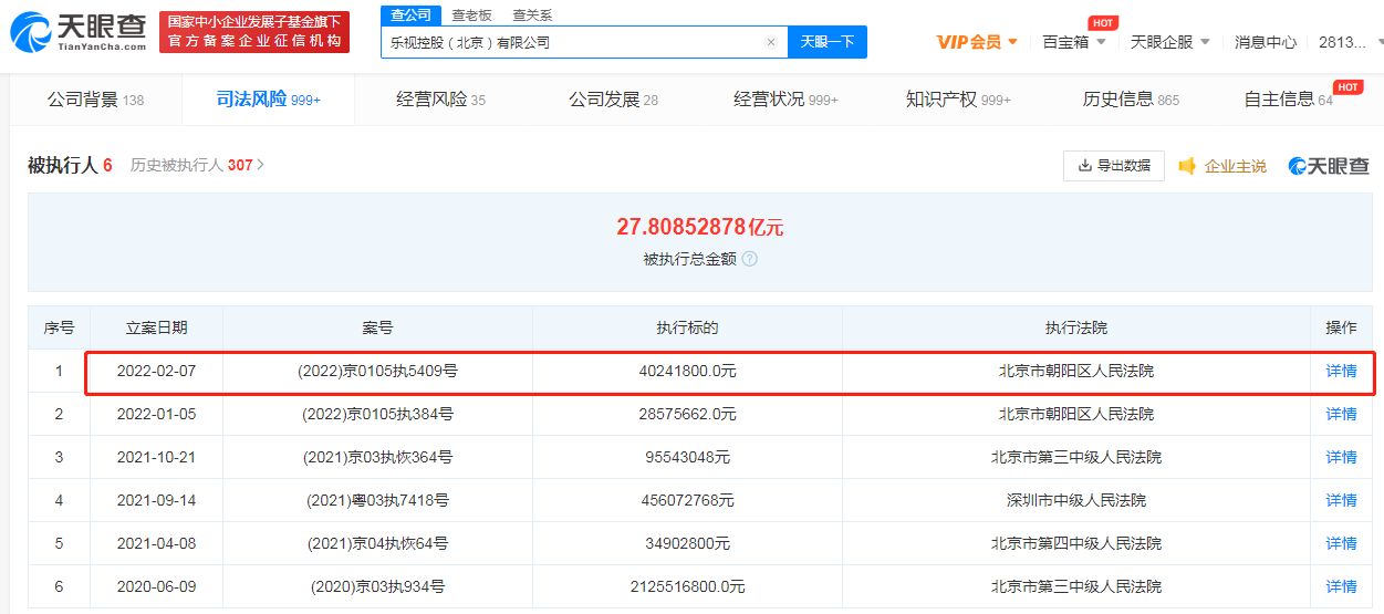 风险信息显示,乐视控股(北京)有限公司目前存在多条被执行人信息,被执行总金额超27.8亿元。