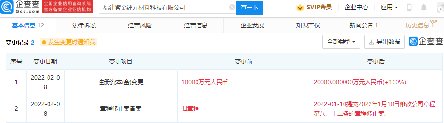 紫金矿业关联公司注册资本增加至2亿,增幅100%