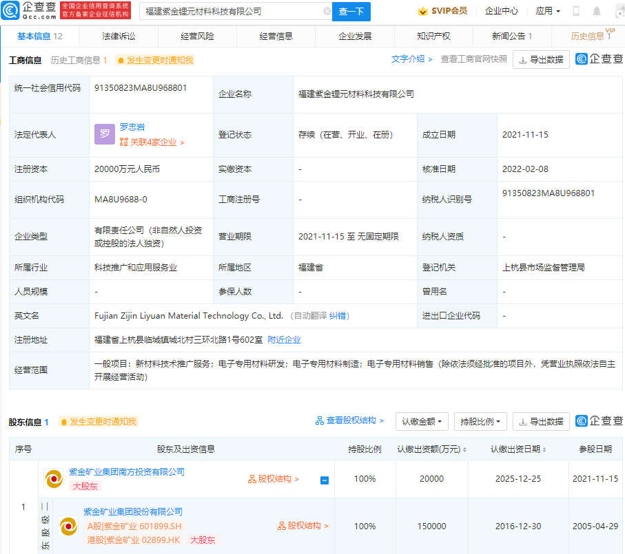 鞭牛士 2月9日消息,昨日,福建紫金锂元材料科技有限公司发生工商变更,公司注册资本由1亿元人民币增加至2亿元人民币,增幅100%。企查查信息显示,该公司成立于2021年,法定代表人为罗忠岩,经营范围包含:新材料技术推广服务;电子专用材料研发;电子专用材料制造;电子专用材料销售,由紫金矿业集团南方投资有限公司100%控股,后者为紫金矿业(601899)全资子公司。