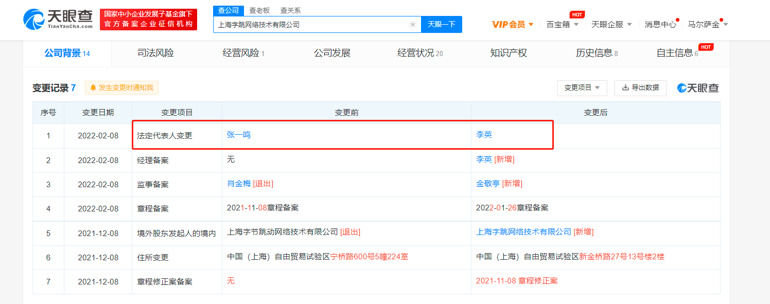 鞭牛士 2月9日消息,昨日,上海字跳网络技术有限公司发生工商变更,法定代表人由张一鸣变更为李英,同时,张一鸣不再担任执行董事一职。