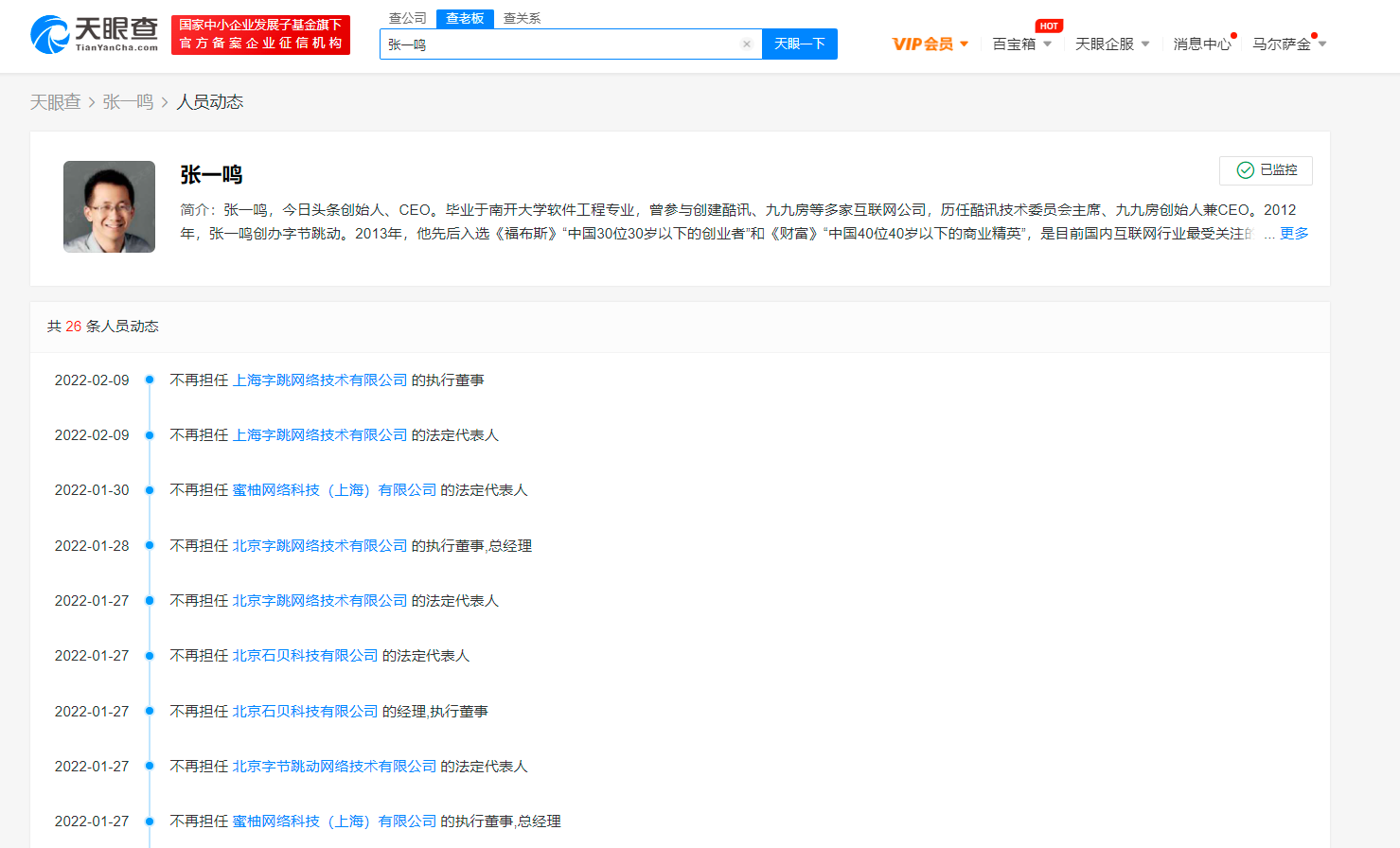 此前,张一鸣已陆续退出多家字节跳动关联公司。