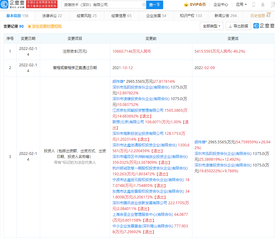 鞭牛士 2月14日消息,今日,小熊U租关联公司凌雄技术(深圳)有限公司发生工商变更,深圳市腾讯创业创新发展有限公司、江苏京东邦能投资管理有限公司、联想(北京)有限公司等多名股东退出,同时公司注册资本由1.07亿元人民币减少至5415.56万元人民币,减幅49.2%。