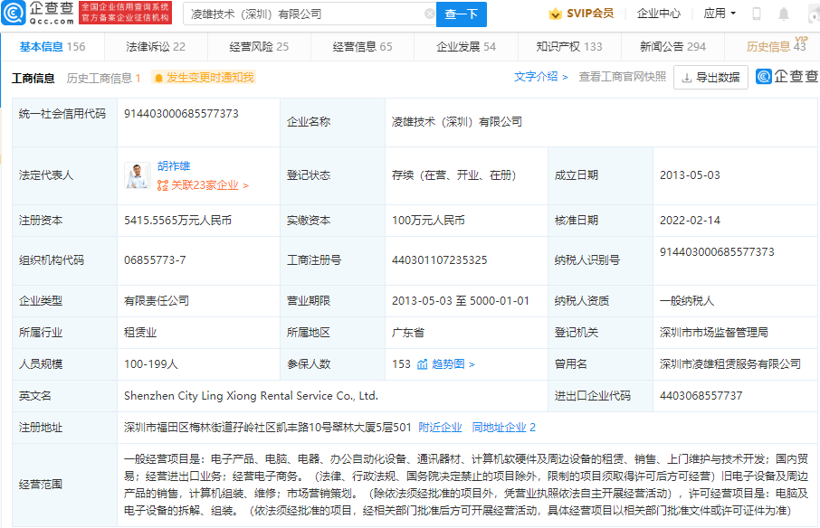 企查查信息显示,该公司成立于2013年,法定代表人为胡祚雄,经营范围包含:电子产品、电脑、电器、办公自动化设备、通讯器材、计算机软硬件及周边设备的租赁、销售、上门维护与技术开发等。