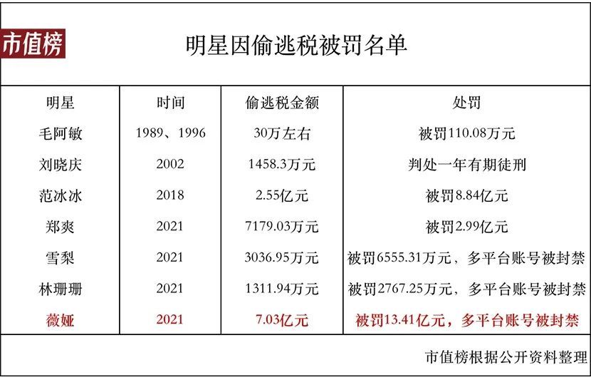 市值榜当时曾统计,13.41亿元这一数字,已经创下了明星、网红个人被罚税款的新纪录:在她之前,影视明星范冰冰在2018年曾被罚8.84亿元。