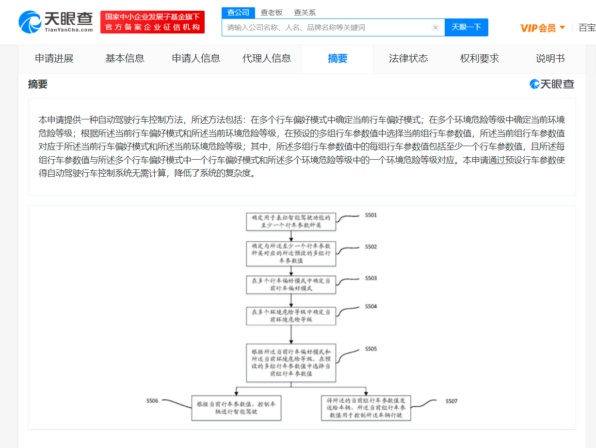 专利摘要显示,所述方法包括:在多个行车偏好模式中确定当前模式,在多个环境危险等级中确定当前等级,根据以上数据选择当前组行车参数值。本申请通过预设行车参数使得自动驾驶行车控制系统无需计算,降低了系统的复杂度。