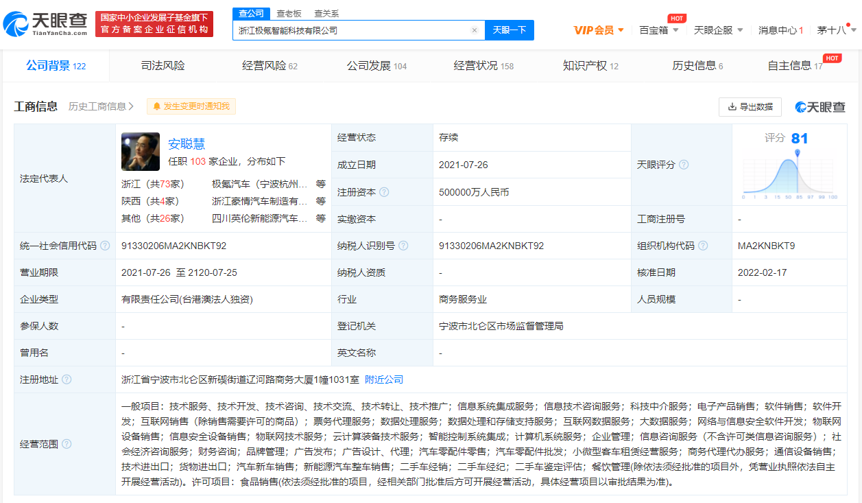 浙江极氪智能科技有限公司成立于2021年7月,法定代表人安聪慧,由ZEEKR TECHNOLOGY LIMITED全资控股。