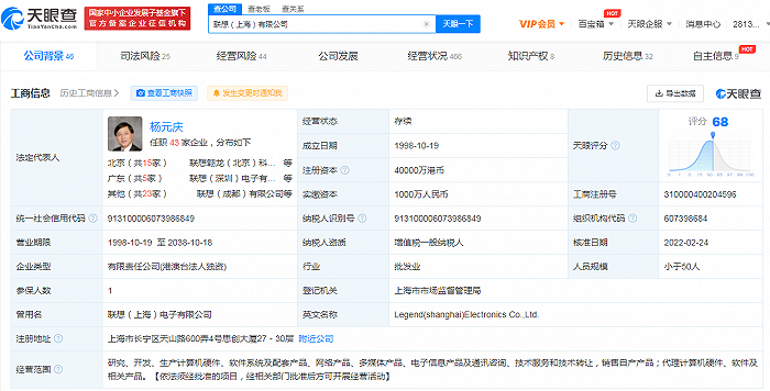 公司法定代表人为杨元庆,经营范围含研究、开发、生产计算机硬件、软件系统及配套产品、多媒体产品;销售自产产品等,由香港联想集团有限公司全资持股。