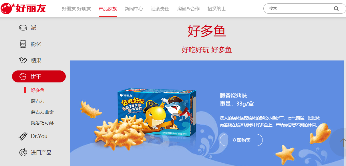 好丽友食品有限公司隶属于韩国四大食品集团之一--东洋制果集团,在世界巧克力派市场占有70%的份额,公司的目标是不仅成为派类食品中领先的企业,更要成为开发、生产、销售休闲食品的大型综合性食品企业。官网显示,好丽友产品包括派、膨化食品、糖果、饼干等,拥有好多鱼、蘑古力、呀!土豆、薯愿等品牌。