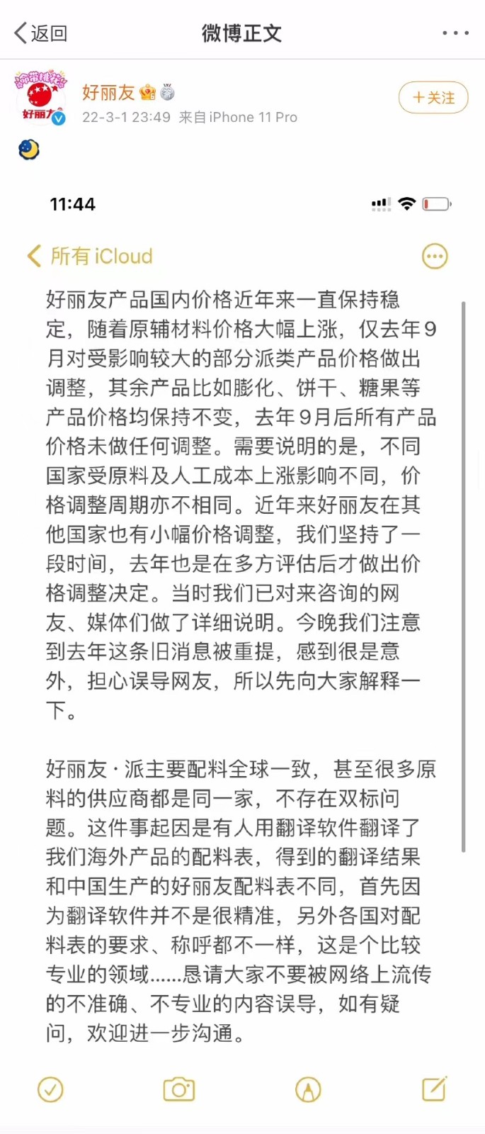 3月1日晚间,好丽友官方微博就涨价一事做出回应。其表示,好丽友产品国内价格近年来一直保持稳定,随着原辅材料价格大幅上涨,仅去年9月对受影响较大的部分派类产品价格做出调整,其余产品比如膨化、饼干、糖果等产品价格均保持不变,去年9月后所有产品价格末做任何调整。需要说明的是,不同国家受原料及人工成本上涨影响不同,价格调整周期亦不相同。当时公司已对来咨询的网友、媒体们做了详细说明。但是今晚去年这条旧日消息被重提,担心误导网友,所以先向大家解释一下。