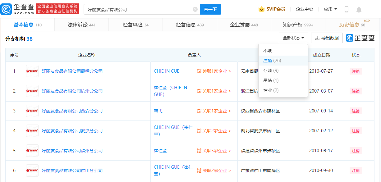 1995年12月,好丽友食品有限公司在廊坊经济技术开发区注册成立。企查查APP显示,当前好丽友食品有限公司共有38家分支机构,但是27家已注销、吊销。