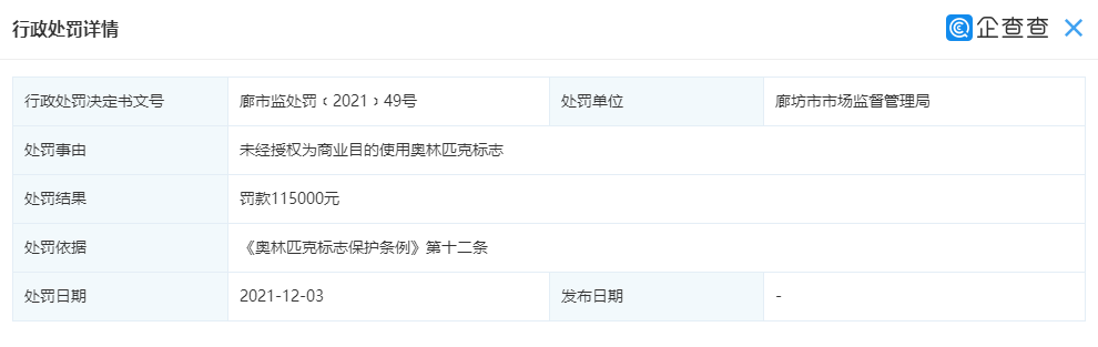 企查查显示,2021年12月,因未经授权为商业目的使用奥林匹克标志,好丽友食品有限公司被罚11.5万元。