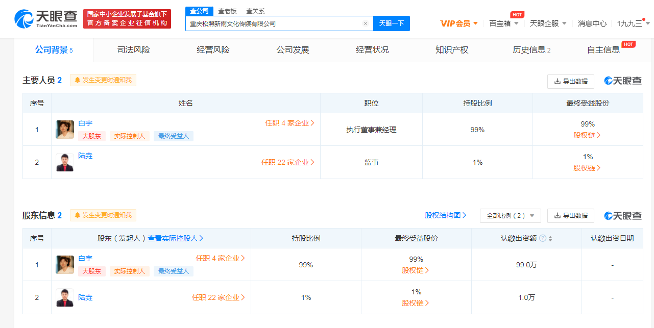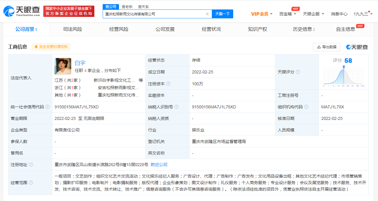 鞭牛士 3月2日消息,近日,重庆松照新雨文化传媒有限公司成立,法定代表人为白宇,注册资本100万,经营范围包括文艺创作;文化娱乐经纪人服务;电影制片;电影摄制服务;版权代理等。股东信息显示,该公司由白宇和陆垚分别持股99%和1%。同时白宇还担任执行董事兼经理职位。
