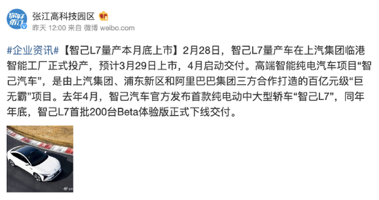 据张江高科技园区官方微博,2月28日,智己L7量产车在上汽集团临港智能工厂正式投产,预计3月29日上市,4月启动交付。