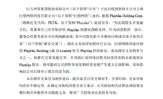 潜在交易的评估程序已启动,巨堃网络间接控制的Playtika Holding UK II Limited作为Playtika控股股东,是该潜在交易的参与方之一。