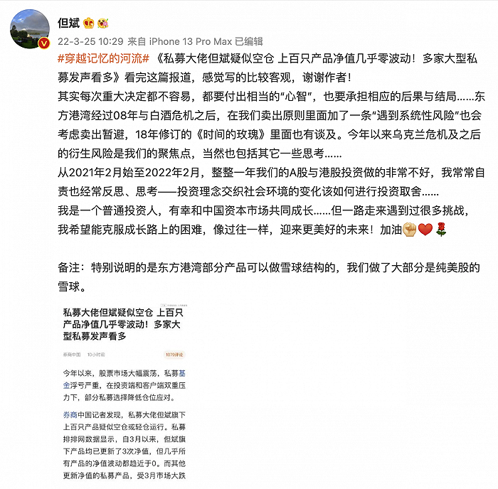 鞭牛士 3月25日消息,今日上午,深圳东方港湾投资管理股份有限公司董事长但斌通过其个人微博回应“疑似空仓”报道,称每次重大决定都不容易,都要付出相当的‘心智’,“从2021年2月始至2022年2月,整整一年我们的A股与港股投资做的非常不好”。