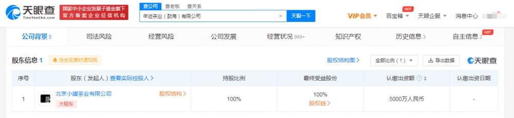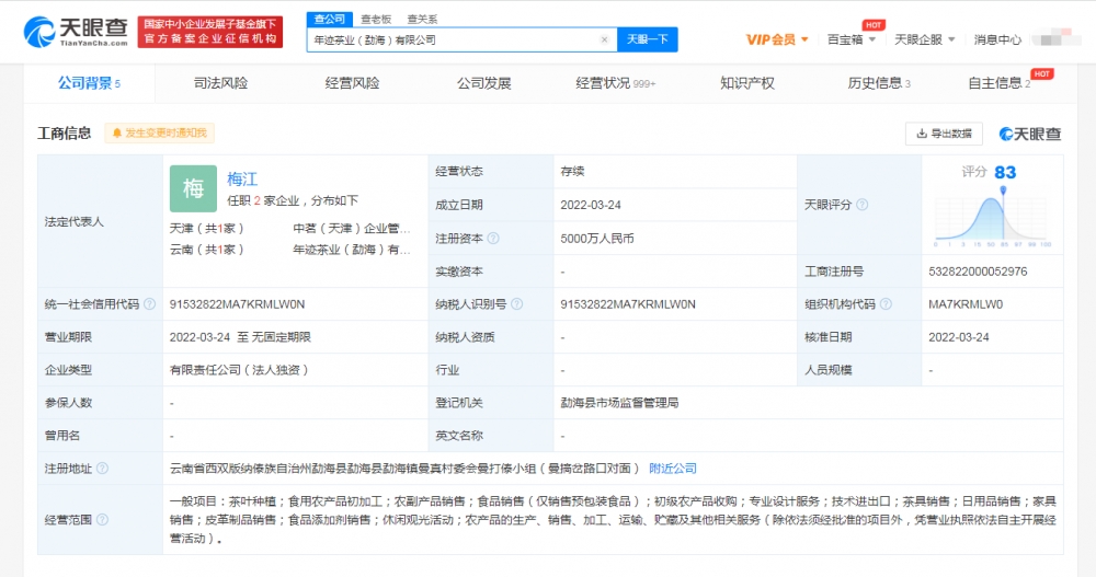 鞭牛士 3月25日消息,据天眼查显示,3月24日,年迹茶业(勐海)有限公司成立,法定代表人为梅江,注册资本5000万人民币,经营范围包括茶叶种植;食用农产品初加工;农副产品销售;休闲观光活动等。股东信息显示,该公司由北京小罐茶业有限公司全资控股。