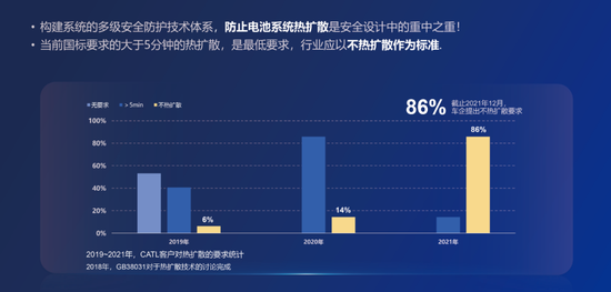 可以看到,2019年有一半的客户对热扩散没有要求;2020年有超过80%的客户要求和国标一致,即热扩散时间不小于5分钟即可,还有14%的客户要求系统不发生热扩散;2021年客户的安全要求有了彻底改变,已有86%的客户要求电池包不发生热扩散。宁德时代的客户基本覆盖了国内外绝大部分车企,这说明不热扩散已经成为车企对电池系统安全性的普遍要求。