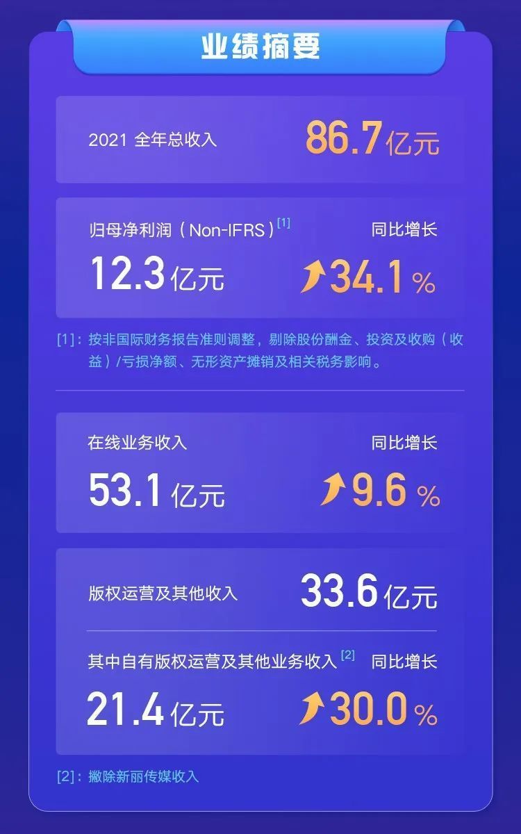 业绩报告显示,2021年阅文集团总收入为86.7亿元,非国际财务报告准则下(Non-IFRS)的归母净利润达12.3亿元,同比增长34.1%。财报披露翌日,阅文集团港股早盘高开高走,盘中涨幅一度逾14%,可见资本市场颇为看好阅文此次交出的“成绩单”。