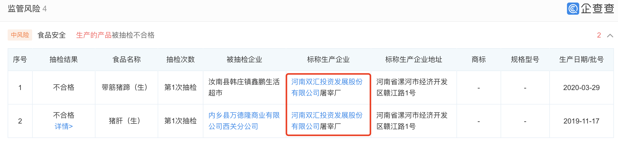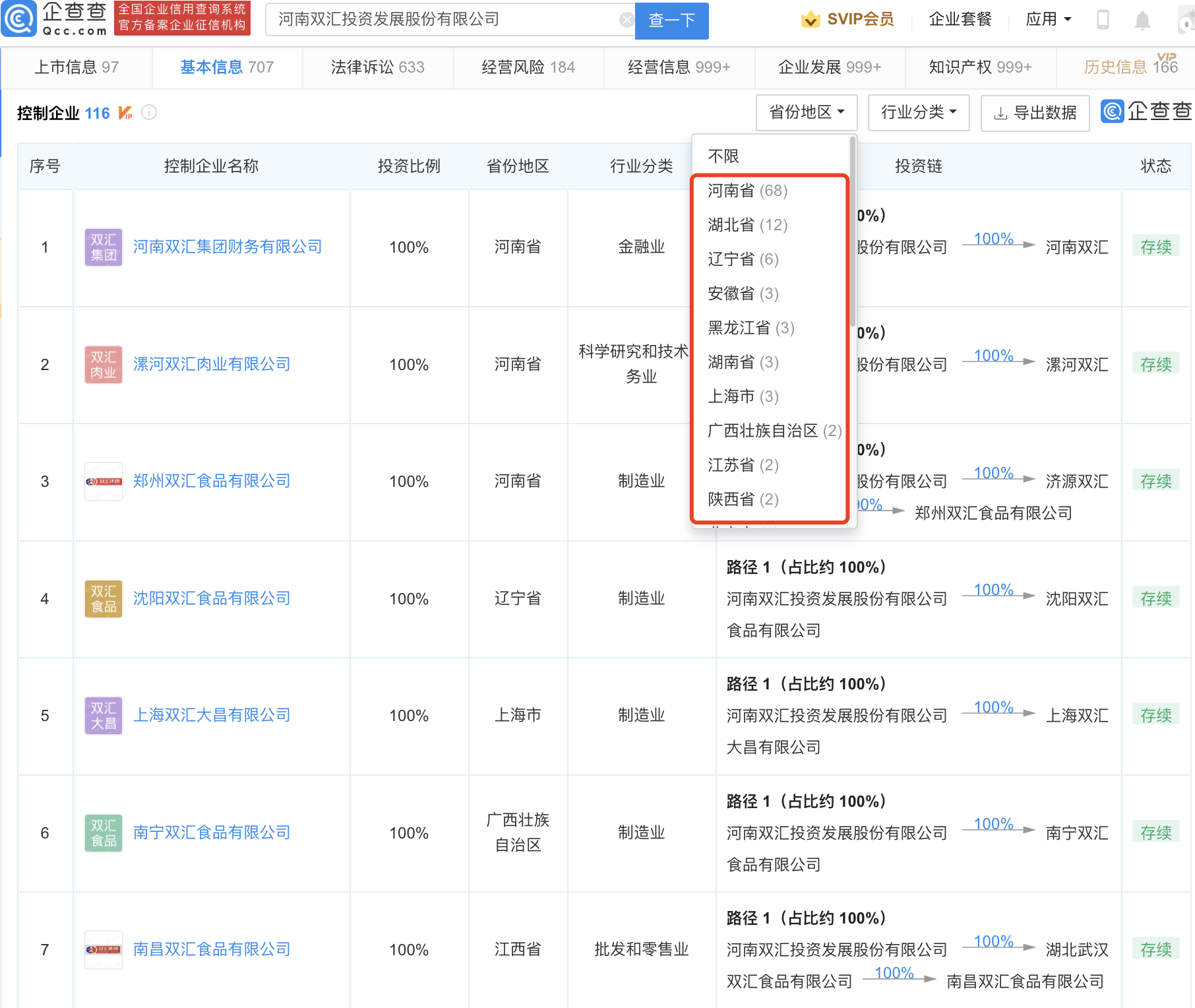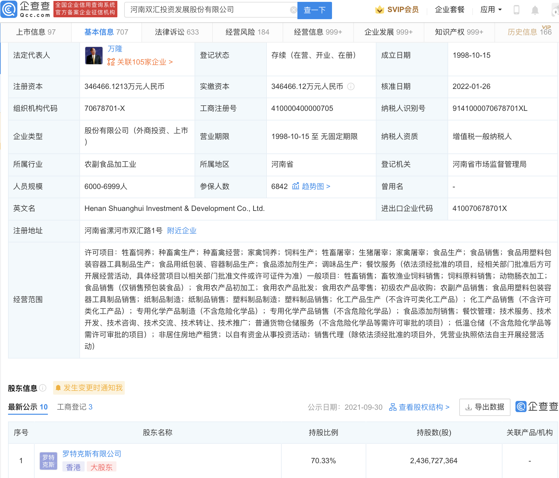 企查查APP显示,双汇是一个肉类加工基地,形成了养殖、饲料、屠宰、肉制品加工、新材料包装、冷链物流、连锁商业等完善的产业链,年产销肉类产品百万吨,拥有近百万个销售终端。双汇发展(000895)成立于1998年,法定代表人为万隆,注册资本34.65亿元人民币,其大股东为罗特克斯有限公司,持股70.33%。企查查信息显示,双汇发展控制企业达116家,省份地区涉及河南、湖北、辽宁、安徽等,行业分类包括金融业、科学研究和技术服务业、制造业等。双汇发展曾于2019年、2020年被检出生产的产品不合格,此外,其多家全资子公司生产的产品也曾被抽检不合格。