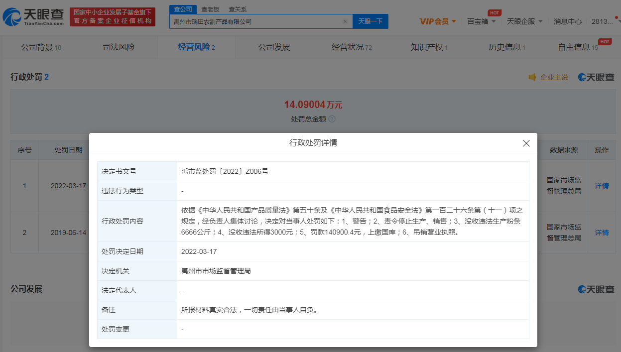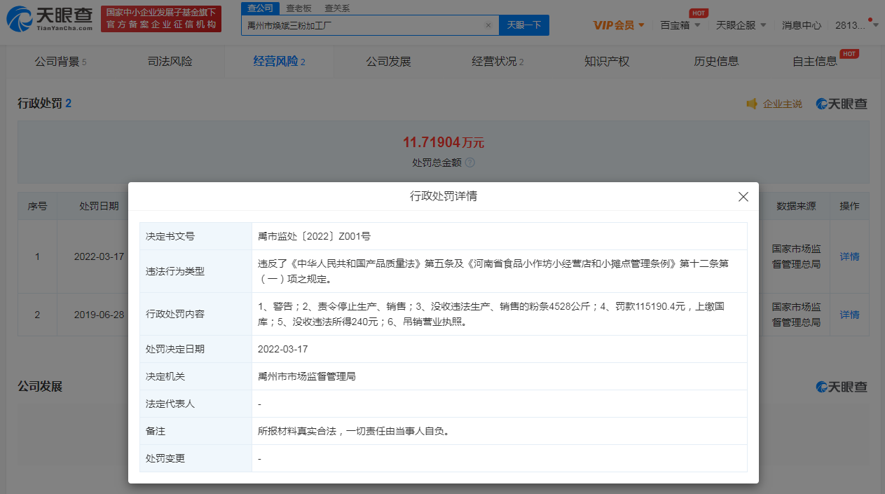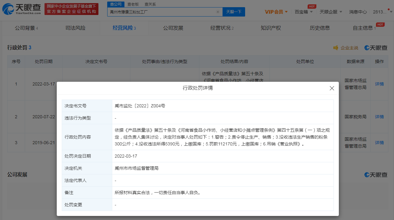 鞭牛士 3月28日消息,天眼查App显示,近日,禹州市瑞田农副产品有限公司、禹州市豫康三粉加工厂、禹州市焕斌三粉加工厂因违反产品质量法等,被禹州市市场监督管理局吊销营业执照,分别没收违法生产的粉条6666公斤、300公斤、4528公斤,并分别罚款约14.09万元、11.21万元、11.51万元。