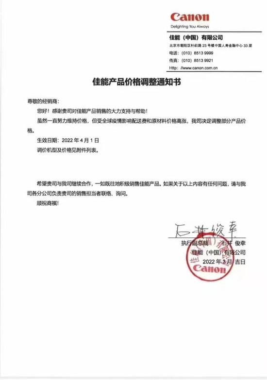 鞭牛士 3月31日消息,据佳能中国发给经销商的通知书显示,受全球疫情影响配送费和原材料价格高涨,佳能中国决定将从4月1日起对部分产品进行价格调整。
