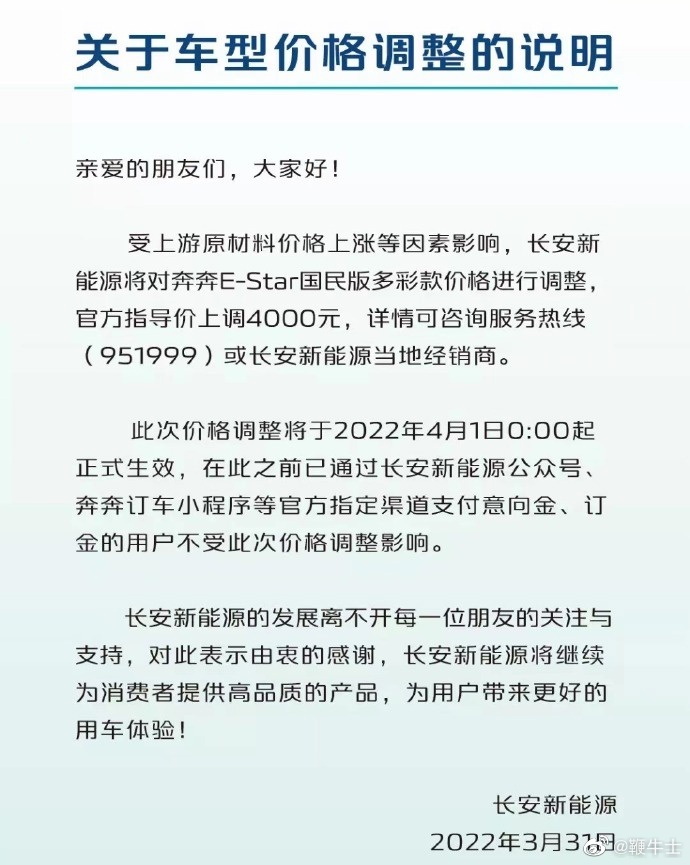 鞭牛士 4月1日消息,昨日,长安新能源发布了关于车型价格调整的说明,长安奔奔E-Star涨价了,国民版多彩款上涨4000元。