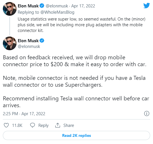 当地时间4月17日,马斯克在Twitter上表示:“我们将根据此前收到的反馈,将移动充电器的价格降至200美元,并让订购过程变得更简单。如果你拥有特斯拉壁挂式充电桩或是使用超级充电站,就不需要移动充电器。我们推荐在车辆交付之前,先安装特斯拉壁挂式充电桩。”