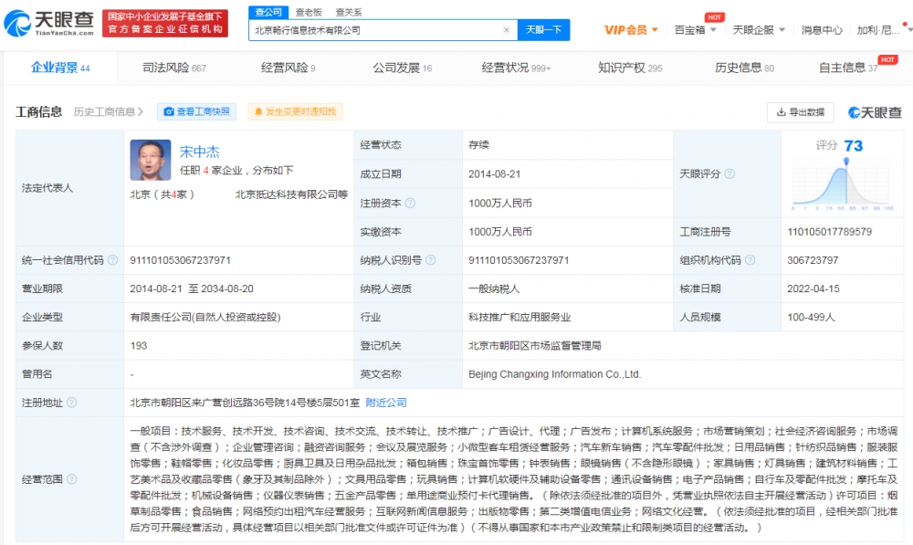 该公司成立于2014年8月,法定代表人宋中杰,经营范围含汽车新车销售;网络预约出租汽车经营服务;网络文化经营等。官网信息显示,嘀嗒出行为互联网出行平台,提供出租车、顺风车服务。