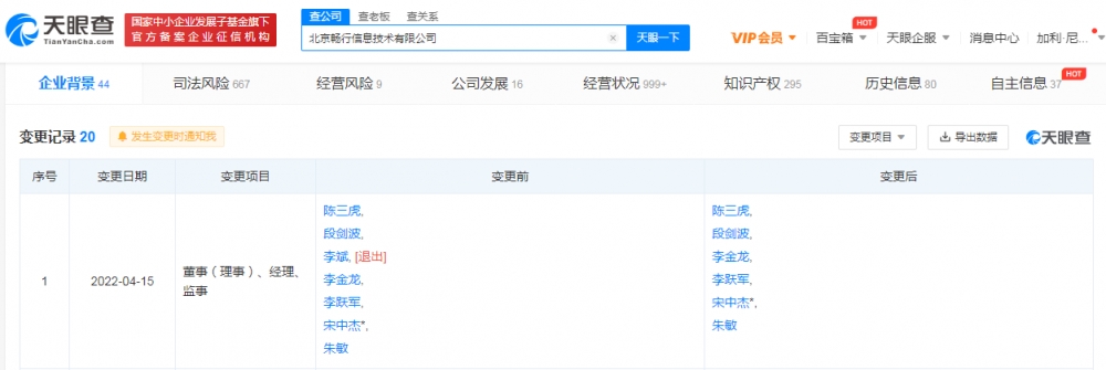 鞭牛士 4月18日消息,近日,“嘀嗒出行”关联公司北京畅行信息技术有限公司发生工商变更,蔚来李斌卸任公司董事,此前,李斌于2015年出任其高管职务。