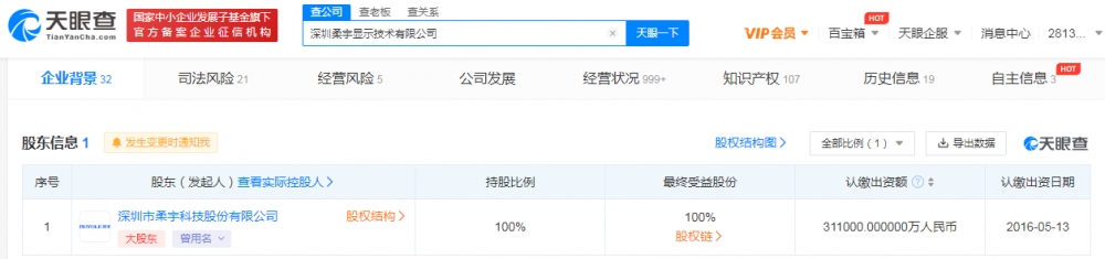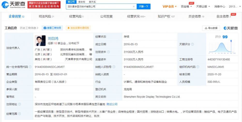 该公司成立于2016年5月,法定代表人为刘自鸿,由深圳市柔宇科技股份有限公司全资持股。此前据报道,柔宇科技被曝资金紧张、大规模拖欠员工工资。