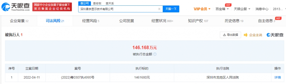 鞭牛士 4月18日消息,据天眼查App显示,近日,深圳柔宇显示技术有限公司新增一则被执行人信息,执行标的146万余元,执行法院为深圳市龙岗区人民法院。