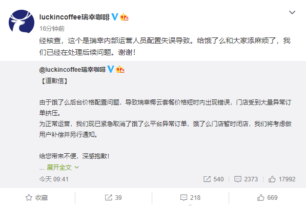 瑞幸再回应“饿了么后台价格配置问题”:内部运营人员失误