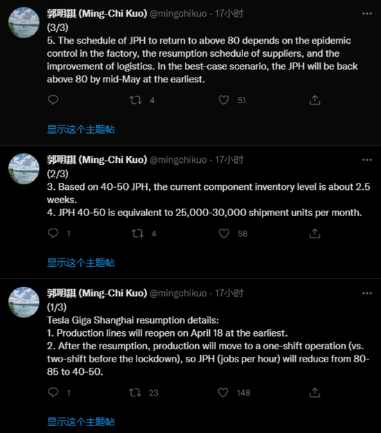 而产业分析师郭明錤昨日在推特上预估,特斯拉上海超级工厂产线最快今天可复工。但复工后特斯拉上海工厂产线将是一班制(one-shift operation),而上海封控前,特斯拉上海厂是两班制,因此每小时工作量(jobs perhour)将会减少,从原先的80个至85个降到40个至50个。他表示,若特斯拉上海厂JPH要回升到80个,需要仰赖工厂防疫控制、供应链的复工进展、以及物流是否明显改善,他预期,特斯拉上海厂产能最快要到5月中旬才会回到封控前水准。