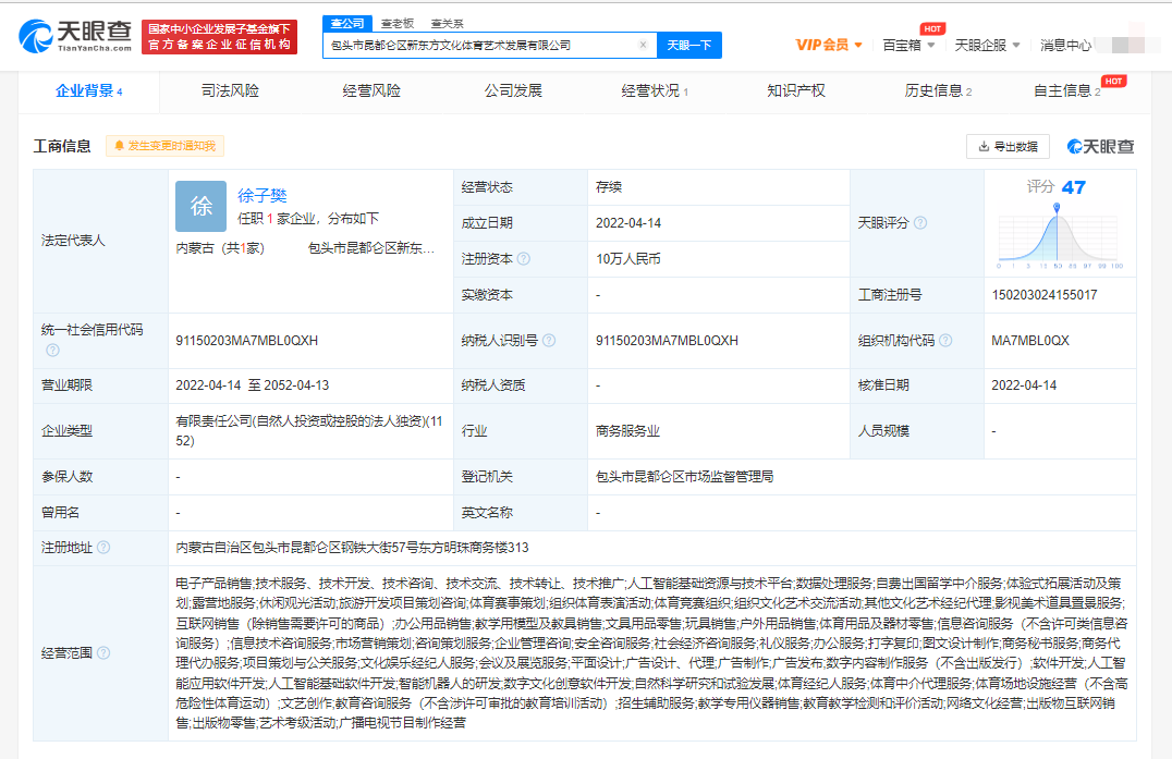鞭牛士 4月18日消息,近日,包头市昆都仑区新东方文化体育艺术发展有限公司成立,法定代表人为徐子樊,注册资本10万人民币。