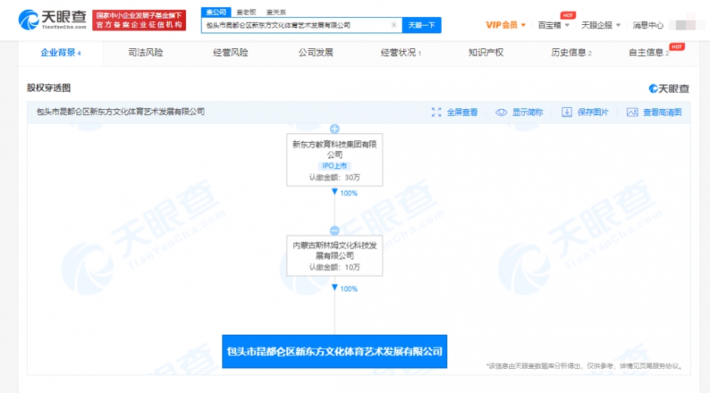 经营范围包括人工智能基础软件开发;智能机器人的研发;数字文化创意软件开发;自然科学研究和试验发展等。股权穿透图显示,该公司由新东方教育科技集团有限公司间接全资控股。