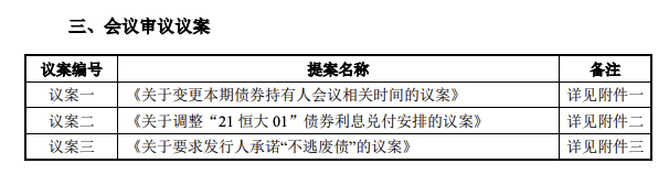鞭牛士 4月21日消息,今日晚间,恒大地产集团有限公司发布公告:定于2022年4月25日至4月26日召开“21恒大01”持有人会议,审议《关于调整“21恒大01”债券利息兑付安排的议案》《关于要求发行人承诺“不逃废债”的议案》等议案。